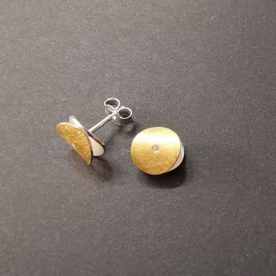 Ohrstecker runde Linse, seitlich offen. Voderseite mit GG 900/-, Durchmesser je 10 mm Je ein Brillant 0,02 ct. mittig eingerieben = 0,04 ct ges.