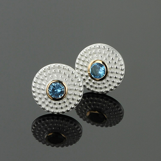 Ohrstecker Scheiben 8,5 mm mit 3 Kreisen Kügelchen granuliert.Mittig Farbstein 3 mm in 750/-GG Fassung.Stifte hinten mittig.