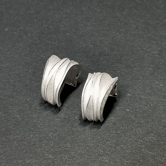 Steckcreolen Klein Wellenmotiv, Durchmesser aussen 16mm, innen 12 mm, Breite Verlauf 10 auf 6,5 mm. Stifte an Winkelblech tiefer gesetzt.Oberfläche gesandet, Streifen obenauf poliert.