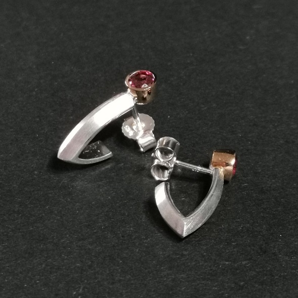 Steckercreolen V-Form, Dreieckprofil Feinmatt, Breite 3,2 mm, je eine Fassung aus 750/-GG am oberen Ende, mit Farbstein 4 mm fac. Länge Oberkante Fassung bis spitze unten 18 mm. Stifte unter der Fassung.