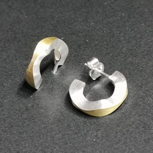 Steckercreole Welle geschlossen, Dreiviertelcreole, Aussenkante mit 900/- GG belötet, Seiten weiss. Aussendurchmesser 16 mm, innen 9 mm; Stärke der Welle bis 3,5 mm. Stifte am Innenkreis für verdecktes Ohrloch