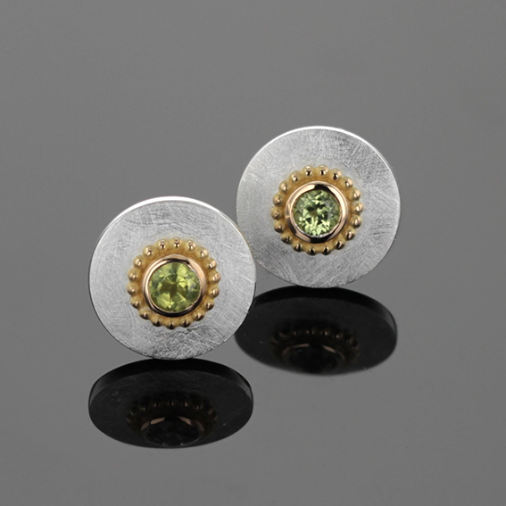 Ohrstecker Silber 925/- Scheiben mit Kügelchen u. Fassung 750/- GG, Farbstein 3 mm. Scheibe hinten flach u. poliert, Durchmesser jew. 9,8 mm, Kügelchenkreis 5 mm. Stifte hinten mittig.