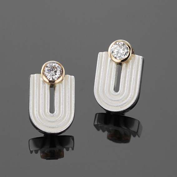 Ohrstecker Silber 925/- mit 750/- GG Fassungen jew. oben mittig, LGD Brillant jew. 0,10 ct. = 0,20 ct. Total. Breite p. Stück 7,8 mm, Höhe 12 mm inkl. Fassung.Stifte angelötet am unteren Ende der Goldfassung.