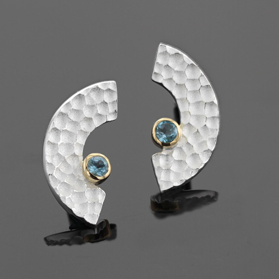 Ohrstecker Silber 925/- mit Fassung 750/- GG, kleiner Bogen mit Lavamuster, Farbstein 2,5 mm. Größe 16 x 7 mm. Stifte im oberen Drittel.