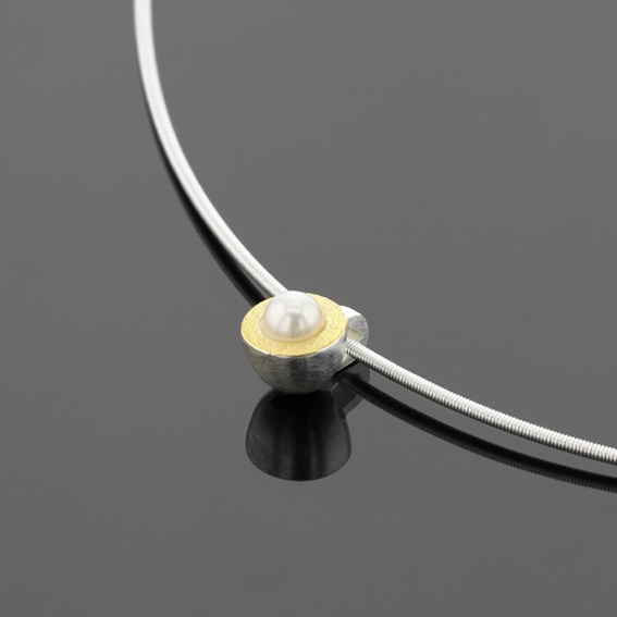 Anhänger MINI Halbkugel 6,5 mit weißer Perle 3 mm mittig, Rand mit 900/-GG belötet. Halbverdeckte Öse innen 2,9 x 2,2 mm.