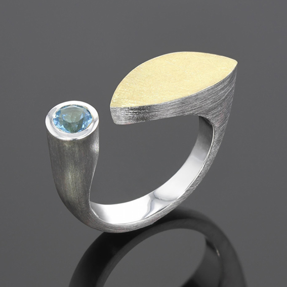 Ring offen mit mittlerem Navette mit 900/-GG belötet und Farbstein 5 mm