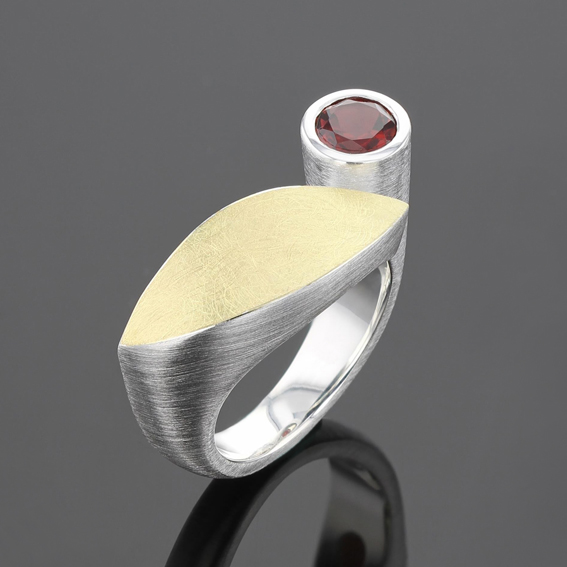 Ring mit großer Navette und freistehender Fassung für Farbstein 6mm.Navette 22 x 9 mm mit 900/-GG belötet.