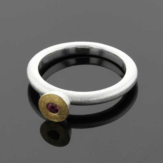 Ring stapelbar mit aufgesetzter Halbkugel, oben 900/-GG belötet, Farbstein 3 mm facettiert.
