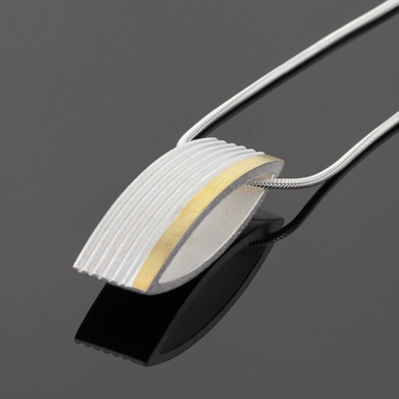 Anhänger Silber mit 5 Rillen und einem FG-aufgelötetem Goldstreifen seitlich, 9,5 mm breit, 30 mm hoch. Rückseite identisch gewölbt, aussen poliert. Steg innen mittig gegen Umdrehen.