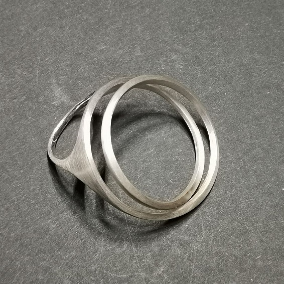 Asymetrischer Silber-Designerring "Doppelkringel", Kreis Durchmesser aussen 36 - 38 mm, Gesamthöhe 26 mm. Gewicht in RW 61 = 10,8 Gramm. Feinmatt.