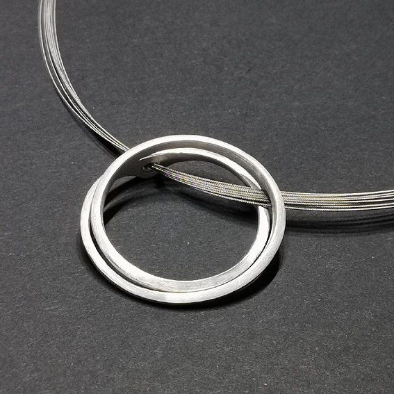 Anhänger "Doppelkringel" groß, Durchmesser 38 mm, aus Vierkantprofil 2 x 2 mm. Feinmatt, eine Öse, Schnüre wird sichtbar durchgefädelt.