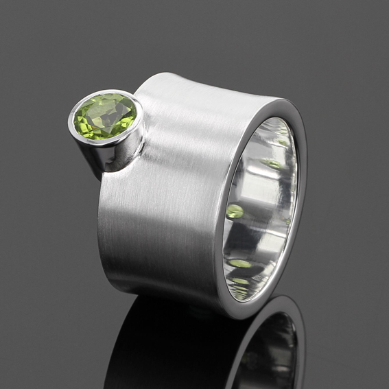 Massiver Silberring breit konkav mit seitlich angesetzter Fassung, Farbstein 7 mm, Blautopas, Peridot, Citrin. Rhodolith gegen Aufpreis.