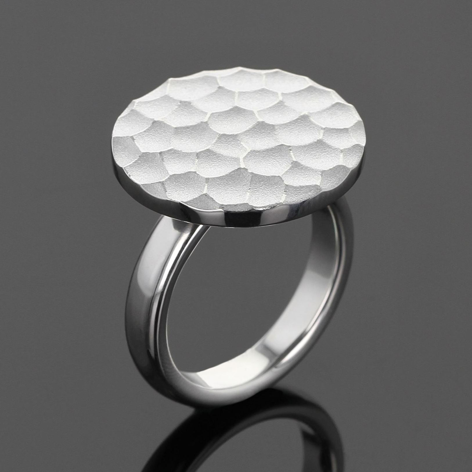 Ring klein mit aufgesetzter Scheibe mit grober Lavastruktur, Durchmesser 20mm = kleine Version. Schiene gleichlaufend 4 mm breit, 2 mm stark.Scheibe massiv, Verlauf 2 - 3 mm stark