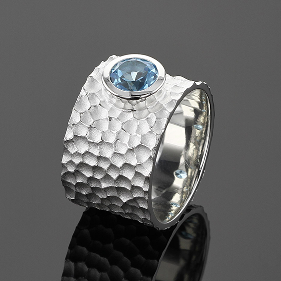 Bandring 13,5 mm breit, Oberfläche feine Lavastruktur, Schiene flaches Band leicht konkav, Fassung AG obenauf, Farbstein 6 mm