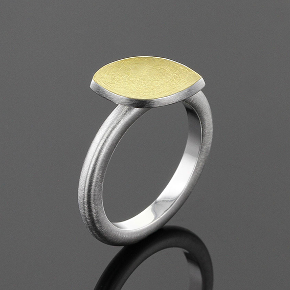 Ring Blatt leicht konkav 14 x 9 mm, oben 900/-GG belötet.Auf Wunsch mit 1 Brillant 0,02 ct. W-Si an einem Ende.Schiene Rundprofil 2,7 x 1 mm.