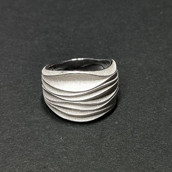 Ring breit Wellenmotiv Verlauf, Breite von 16 mm oben bis 6 mm unten. Unten eine glatte Stelle für RW Änderungen. Stärke 2 mm.Oberfläche gesandet, Wellenstreifen poliert.