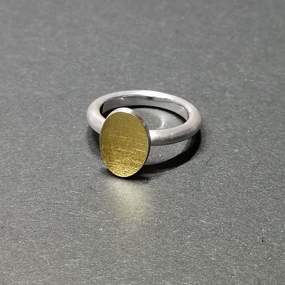 Ring aufgesetztes leicht konkaves Oval 13,5 x 9,5 mm, obenauf mit 900/-Gg belötet, Stoffmatt.