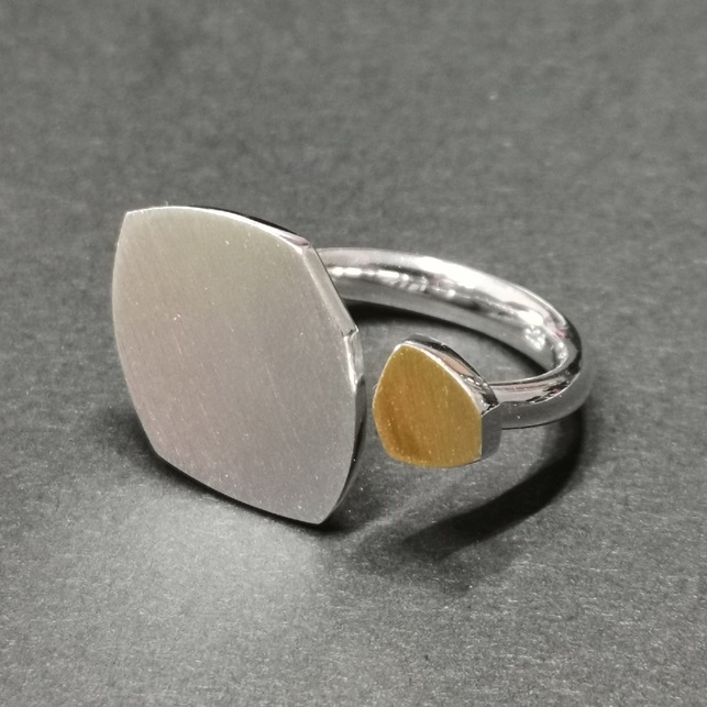 Ring groß Blatt mit unregelmäßiges Sechseck, obenauf mit 900/- GG belötet,Feinmatt, Maße Ringkopf 26 x 17 mm, Schiene Rundprofil 3- 4 mm x 2 mm