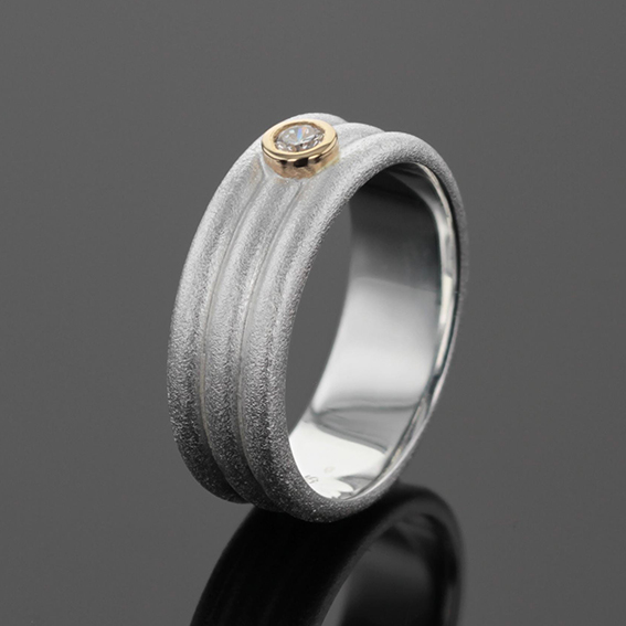 Ring 3er-Schiene Silber 925/- mit Fassung 750/-GG, 1 LGD Brillant 0,10 ct. Breite 7 mm, Fassung obenauf 4 mm.