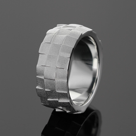 Bandring Silber 925/- mit ebenversetzten Quadraten. Breite 9 mm, Stärke bis 3 mm. Unten ein glatter Bereich für RW-Änderungen.