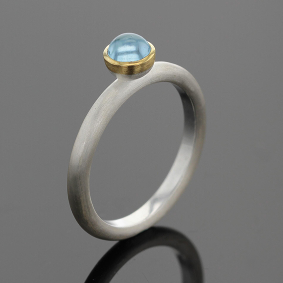 Ring Silber 925/- mit Fassrand 750/- GG, Farbstein Cabochon 5 mm. Stapelbar. Schiene Rundprofil 2,5 x 2 mm innen flach.