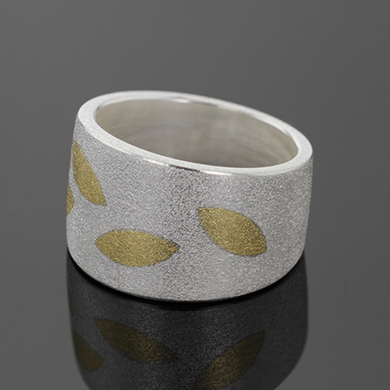 Ring im Verlauf Silber 925/- mit vier eingelegten größeren 750/- GG Navetten. Breite oben 13,5 mm, unten 8 mm. Auf Wunsch mit eingeriebem Brillant 0,025 ct. W-Si., siehe R1889-1
