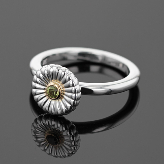 Ring Flower Silber 925/- mit Fassung 750/- GG, Farbstein 2,5 mm. Schiene poliert Rundprofil 2,5 x 2 mm innen flach. Kopf Durchmesser 10,5 mm, Fassung 3,5 mm. Auch unten Flower Design.
