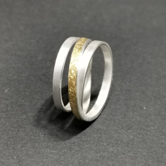 Wickelring Silber 925/-, 9-10 mm, 3-reihig, mittlere Reihe mit Gold 900/- belötet + eismatt