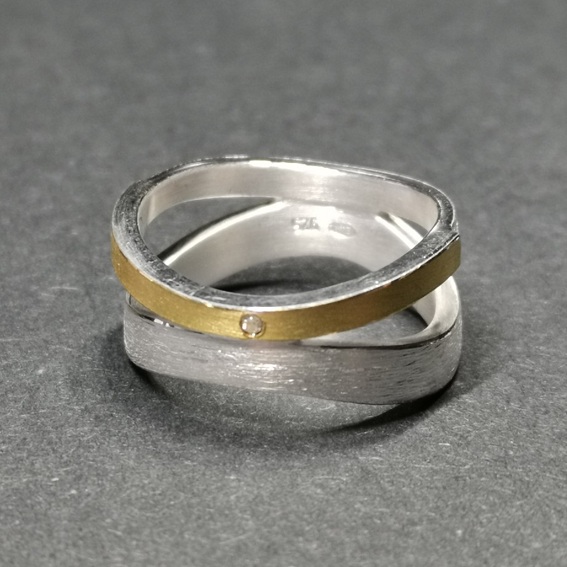 Silber 925/-, doppelete Welle breit, Silberwelle breit, obere Hälfte der schmalen Welle mit 900/- GG belötet, oben mittig 1 Brillant 0,01 ct. W-Si im Gold. Feinmatt. Breite 6 - 10 mm.