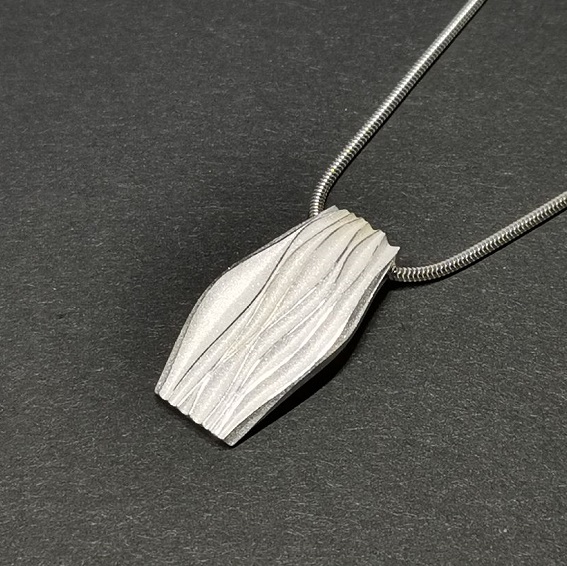 Anhänger Wellenmotiv 31 x 16 mm, leicht gewölbt, Verkaderung 2 mm.Große Öse auf der Rückseite. Gesandet, Wellenstreifen obenauf poliert.
