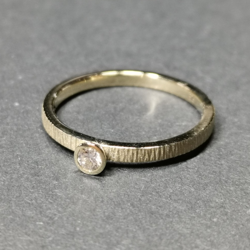 Goldring Solitär 375/- GG, konische Zargenfassung aufgesetzt 4 mm, mit 1 LGD-Brillant 0,10 ct., stapelbar, Schiene mit gestrichelter Oberfläche, Vierkantprofil 2 mm breit und 1,5 mm stark, innen bombiert. Preis gilt bis einschließlich RW 58. Größere Weiten bitte auf Anfrage.