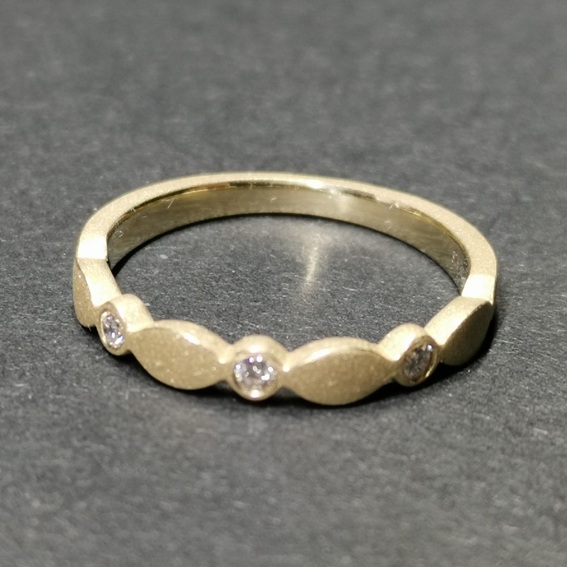 Goldring 375/- GG mit 3 Brillanten ges. 0,075 ct. W-Si und 4 Ovale in der oberen Hälfte, Breite 3 mm, Schiene unten im verjüngend auf 2 mm Breite, Stärke oben 1,5 mm, unten 1 mm.