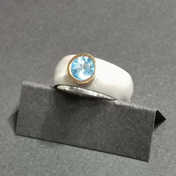 Einsteiner Ring L, Schiene beidseitig bombiert, Verlauf von 8,5 auf 6 mmFarbstein 4 mm facettiert, aufgesetzte Fassung mit Fassrand in 750/-GG