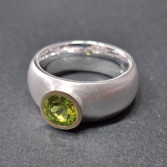 Einsteiner Ring XL, Schiene beidseitig bombiert, Verlauf von 9,5 auf 7 mmFarbstein 4 mm facettiert, aufgesetzte Fassung mit Fassrand in 750/-GG