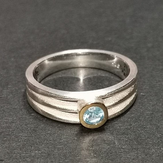 Dreischiener-Ring L, mit Farbstein 4 mm mittig, in Silber mit Fassrand in 750/-GG. Schiene mit Verlauf 6,5 auf 3,5 mm