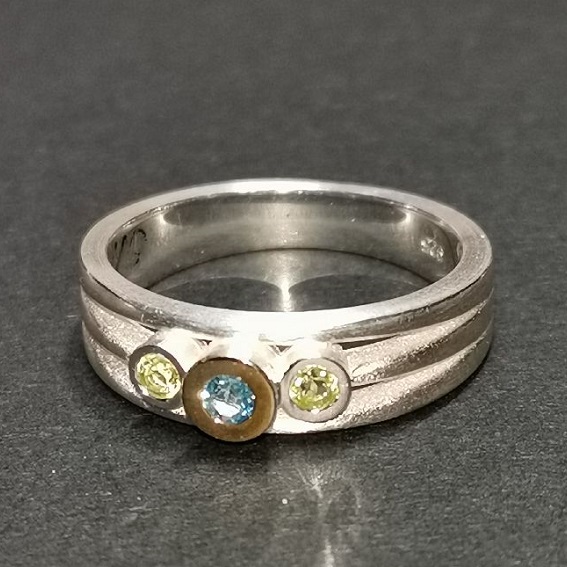 Dreischiener-Ring, mit 3 Farbsteinen, 2x 2 mm und 1x 2,5 mm mittig, in Silber mit Fassrand in 750/-GG. Schiene mit Verlauf 6,5 auf 3,5 mm.