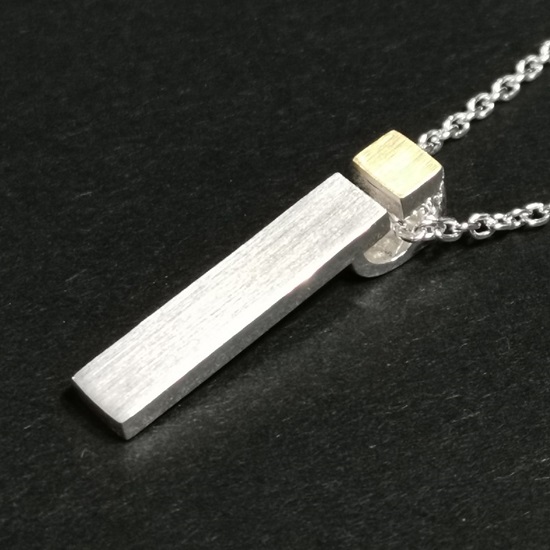 Anhänger Stab Rechteckprofil, Breite 5 mm, Länge 26 mm. Feinmatt.Oben Öse, durch Sägeschnitt offen, kleines Rechteck mit 900/- GG belötet.Ösenöffnung 4 x 2,5 mm