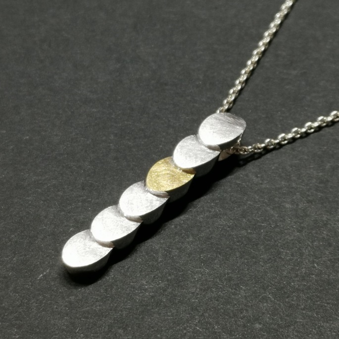 Anhänger Stab Ovale, Länge 38 mm, Breite 6,5 mm, Stärke 3,5mm, 1 Oval mit 900/- GG belötet. Ösenöffnung 4 x 3 mm innen. Eismatt.