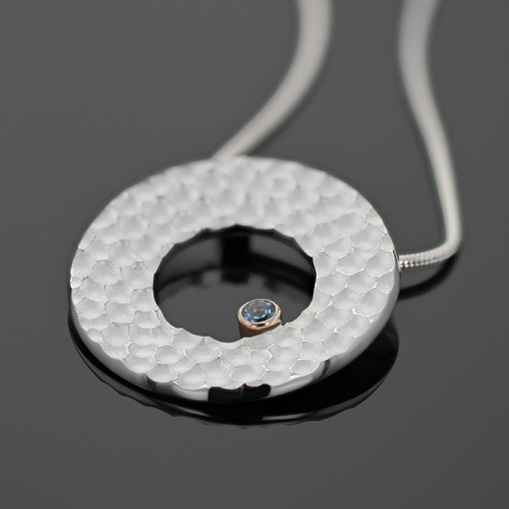 Anhänger rund Lavastruktur, 925/- AG mit Fassung 750/- GG asymmetrisch bei 16 Uhr, 1 LGD-Brillant 0,10 ct. Durchmesser aussen ca. 27 mm. Zwei versteckte Ösen hinter dem oberen Drittel.