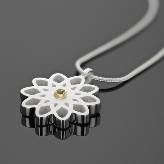 Anhänger Blume Silber 925/- mit Fassung 750/- GG, Farbstein 2,5 mm mittig. Durchmesser 22 mm, Stärke 3 mm, Goldfassung 3,5 mm. Öse Innendurchmesser 4 x 3 mm. Sehr solide.