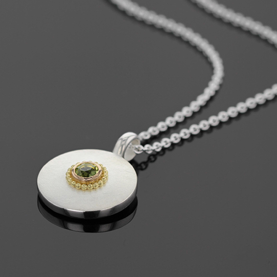 Anhänger Silber 925/- Scheibe mit Kügelchen u. Fassung 750/- GG, Farbstein 4 mm. Beidseitig leicht bombiert, Rückseite poliert. Scheibe 16 mm, Kügelchenkreis 6 mm.