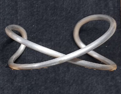 Armspange Runddraht gekreuzt, an breitester Stelle 25 - 32 mm.Maße aussen: 67 x 55 mm, innen 60 x50 mm.Gewicht: 34 Gramm