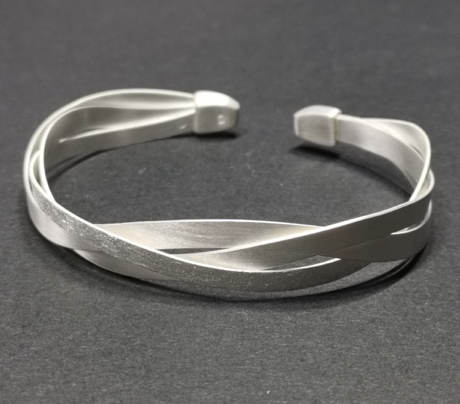 Armspange Silber 925/-, 3-reihig, 1 Band 3mm eismatt, 2 Bänder 4mm. Maß innen 58 x 48 mm, aussen 63 x 53 mm. Leicht flexibel für gute Passform